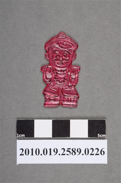 1.本物件為殭屍尪仔仙。硬質塑膠材質,扁平,單一紅色,雙面浮雕圖案,兩面圖案相同。圖案為Q版男性殭屍,因有橢圓形黑眼圈。其嘴巴張開,表情呈高興貌,頭戴古代官帽,官帽上貼有1張符咒,符咒揚起,身穿古代官服,胸前有補子,身上掛有朝珠,雙手往前舉起。
