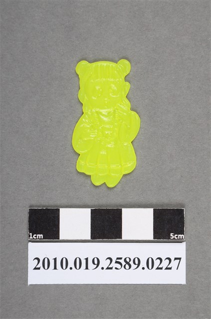 1.本物件為殭屍尪仔仙。硬質塑膠材質,扁平,單一不透明黃色,雙面浮雕圖案,兩面圖案相同。圖案為Q版女性殭屍,因有橢圓形黑眼圈。其頭上綁有2個髮髻,有瀏海,身穿古代裙裝,裙子有摺,胸前戴有1串長珠子。一手指著下臉頰,另一手放腰前,腳尖踮起。2.尪仔仙尺寸大致可分成小、中、大型,小型約長2-5公分,中型約長8-15公分,顏色以單色為主。有些大型的則可長達30公分左右,以菩薩、神仙和民間傳說故事人物等造型為主,塗上金銀紅黃彩漆等亮色。1960、70年代的尪仔仙多以民間傳說故事、歌仔戲、布袋戲人物為造型。1980年代改以卡通、電玩、漫畫人物造型為主。常見玩法之一為兩人(或多人)各持一只尪仔仙,輪流用手指彈射,看誰的尪仔仙先疊在對方上面,便可贏得對方用來對戰或是約定的尪仔仙。