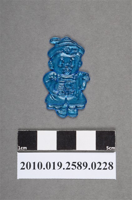1.本物件為殭屍尪仔仙。硬質塑膠材質,扁平,單一藍色,雙面浮雕圖案,兩面圖案相同。圖案為Q版男性殭屍,因有橢圓形黑眼圈。其嘴巴張開,表情呈開心貌,頭戴古代官帽,官帽上貼有1張符咒,符咒揚起,身穿古代官服,胸前有補子,身上掛有朝珠。一手往前舉,一手放胸前,腳尖踮起。2.尪仔仙尺寸大致可分成小、中、大型,小型約長2-5公分,中型約長8-15公分,顏色以單色為主。有些大型的則可長達30公分左右,以菩薩、神仙和民間傳說故事人物等造型為主,塗上金銀紅黃彩漆等亮色。1960、70年代的尪仔仙多以民間傳說故事、歌仔戲、布袋戲人物為造型。1980年代改以卡通、電玩、漫畫人物造型為主。常見玩法之一為兩人(或多人)各持一只尪仔仙,輪流用手指彈射,看誰的尪仔仙先疊在對方上面,便可贏得對方用來對戰或是約定的尪仔仙。