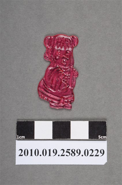 1.本物件為殭屍尪仔仙。硬質塑膠材質,扁平,單一紅色,雙面浮雕圖案,兩面圖案相同。圖案為Q版女性殭屍,因有橢圓形黑眼圈。其頭上綁有2個髮髻,有瀏海,身穿古代裙裝。雙手舉起,臀部往後翹。2.尪仔仙尺寸大致可分成小、中、大型,小型約長2-5公分,中型約長8-15公分,顏色以單色為主。有些大型的則可長達30公分左右,以菩薩、神仙和民間傳說故事人物等造型為主,塗上金銀紅黃彩漆等亮色。1960、70年代的尪仔仙多以民間傳說故事、歌仔戲、布袋戲人物為造型。1980年代改以卡通、電玩、漫畫人物造型為主。常見玩法之一為兩人(或多人)各持一只尪仔仙,輪流用手指彈射,看誰的尪仔仙先疊在對方上面,便可贏得對方用來對戰或是約定的尪仔仙。