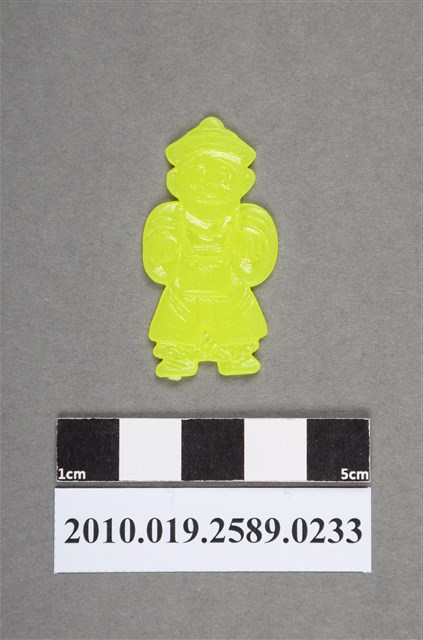 1.本物件為殭屍尪仔仙。硬質塑膠材質,扁平,單一不透明黃色,雙面浮雕圖案,兩面圖案相同。圖案為Q版男性殭屍,因有橢圓形黑眼圈。其表情呈委屈貌,黑眼圈上有表情紋,戴有官帽,身穿官服,胸前有補子,戴有朝珠,雙手往前舉起。2.尪仔仙尺寸大致可分成小、中、大型,小型約長2-5公分,中型約長8-15公分,顏色以單色為主。有些大型的則可長達30公分左右,以菩薩、神仙和民間傳說故事人物等造型為主,塗上金銀紅黃彩漆等亮色。1960、70年代的尪仔仙多以民間傳說故事、歌仔戲、布袋戲人物為造型。1980年代改以卡通、電玩、漫畫人物造型為主。常見玩法之一為兩人(或多人)各持一只尪仔仙,輪流用手指彈射,看誰的尪仔仙先疊在對方上面,便可贏得對方用來對戰或是約定的尪仔仙。