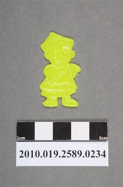 1.本物件為殭屍尪仔仙。硬質塑膠材質,扁平,單一不透明黃色,雙面浮雕圖案,兩面圖案相同。圖案為Q版男性殭屍,因有橢圓形黑眼圈。其戴有官帽,官帽上貼有1張符咒,符咒揚起,身穿官服,胸前戴有朝珠。身體有些側身,雙手往前舉起。2.尪仔仙尺寸大致可分成小、中、大型,小型約長2-5公分,中型約長8-15公分,顏色以單色為主。有些大型的則可長達30公分左右,以菩薩、神仙和民間傳說故事人物等造型為主,塗上金銀紅黃彩漆等亮色。1960、70年代的尪仔仙多以民間傳說故事、歌仔戲、布袋戲人物為造型。1980年代改以卡通、電玩、漫畫人物造型為主。常見玩法之一為兩人(或多人)各持一只尪仔仙,輪流用手指彈射,看誰的尪仔仙先疊在對方上面,便可贏得對方用來對戰或是約定的尪仔仙。