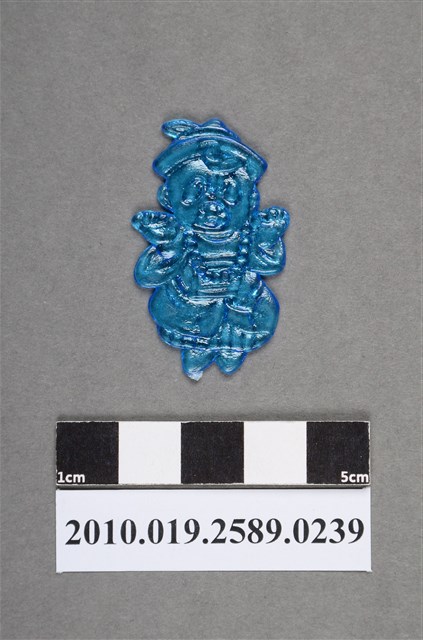 1.本物件為殭屍尪仔仙。硬質塑膠材質,扁平,單一藍色,雙面浮雕圖案,兩面圖案相同。圖案為Q版男性殭屍,因有橢圓形黑眼圈。其嘴巴張開,可見尖牙,表情呈驚慌貌,戴有官帽,官帽上貼有1張符咒,符咒揚起,身穿官服,胸前戴有朝珠。雙手往前舉起,腳尖踮起,整體呈現跳動感覺。2.尪仔仙尺寸大致可分成小、中、大型,小型約長2-5公分,中型約長8-15公分,顏色以單色為主。有些大型的則可長達30公分左右,以菩薩、神仙和民間傳說故事人物等造型為主,塗上金銀紅黃彩漆等亮色。1960、70年代的尪仔仙多以民間傳說故事、歌仔戲、布袋戲人物為造型。1980年代改以卡通、電玩、漫畫人物造型為主。常見玩法之一為兩人(或多人)各持一只尪仔仙,輪流用手指彈射,看誰的尪仔仙先疊在對方上面,便可贏得對方用來對戰或是約定的尪仔仙。