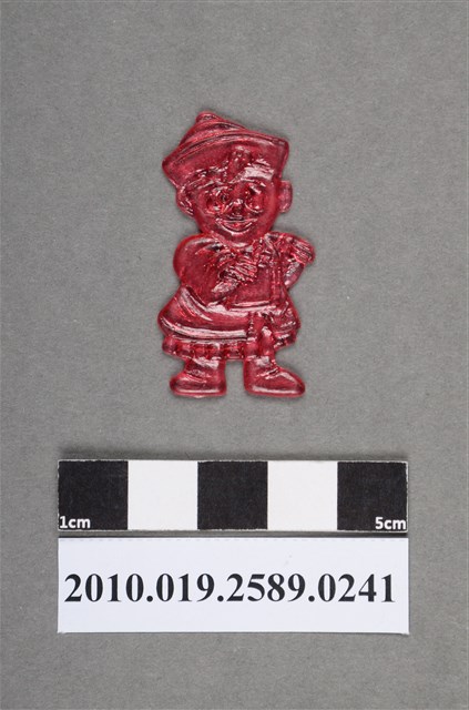 1.本物件為殭屍尪仔仙。硬質塑膠材質,扁平,單一紅色,雙面浮雕圖案,兩面圖案相同。圖案為Q版男性殭屍,因有橢圓形黑眼圈。其戴有官帽,官帽上貼有1張符咒,符咒揚起,身穿官服,胸前戴有朝珠。身體有些側身,雙手往前舉起。2.尪仔仙尺寸大致可分成小、中、大型,小型約長2-5公分,中型約長8-15公分,顏色以單色為主。有些大型的則可長達30公分左右,以菩薩、神仙和民間傳說故事人物等造型為主,塗上金銀紅黃彩漆等亮色。1960、70年代的尪仔仙多以民間傳說故事、歌仔戲、布袋戲人物為造型。1980年代改以卡通、電玩、漫畫人物造型為主。常見玩法之一為兩人(或多人)各持一只尪仔仙,輪流用手指彈射,看誰的尪仔仙先疊在對方上面,便可贏得對方用來對戰或是約定的尪仔仙。