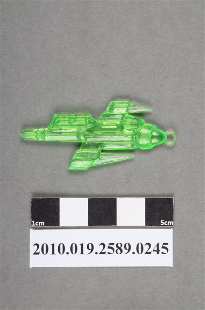 1.本物件為綠色機型尪仔仙。硬質塑膠材質,扁平,單一綠色,雙面浮雕圖案,兩面圖案相同。圖案似飛機形狀,但無尾翼,尾部較細,兩側有機翼部位,機翼有三角尖型設計,尖端朝機頭。機頭前端有小吊環。2.尪仔仙尺寸大致可分成小、中、大型,小型約長2-5公分,中型約長8-15公分,顏色以單色為主。有些大型的則可長達30公分左右,以菩薩、神仙和民間傳說故事人物等造型為主,塗上金銀紅黃彩漆等亮色。1960、70年代的尪仔仙多以民間傳說故事、歌仔戲、布袋戲人物為造型。1980年代改以卡通、電玩、漫畫人物造型為主。常見玩法之一為兩人(或多人)各持一只尪仔仙,輪流用手指彈射,看誰的尪仔仙先疊在對方上面,便可贏得對方用來對戰或是約定的尪仔仙。