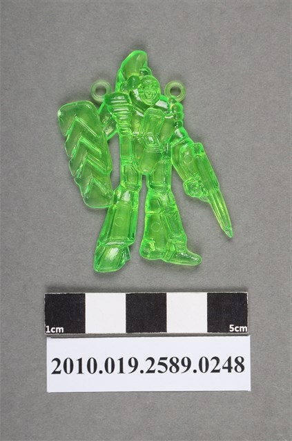 1.本物件為持盾槍機器人型尪仔仙。硬質塑膠材質,扁平,單一綠色,雙面浮雕圖案,兩面圖案相同。圖案為站立的機器人型,一手拿著盾牌,盾牌表面有箭頭圖案,另一手拿著槍。雙肩上有2個小吊環。2.尪仔仙尺寸大致可分成小、中、大型,小型約長2-5公分,中型約長8-15公分,顏色以單色為主。有些大型的則可長達30公分左右,以菩薩、神仙和民間傳說故事人物等造型為主,塗上金銀紅黃彩漆等亮色。1960、70年代的尪仔仙多以民間傳說故事、歌仔戲、布袋戲人物為造型。1980年代改以卡通、電玩、漫畫人物造型為主。常見玩法之一為兩人(或多人)各持一只尪仔仙,輪流用手指彈射,看誰的尪仔仙先疊在對方上面,便可贏得對方用來對戰或是約定的尪仔仙。