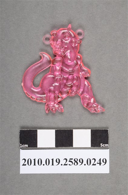 1.本物件為粉紅色恐龍型尪仔仙。硬質塑膠材質,扁平,單一粉紅色,雙面浮雕圖案,兩面圖案相同。圖案為站立的恐龍,頭上有角,鼻孔明顯,手有3指,腳為3趾,有尾巴。頭部兩旁有2個小吊環。2.尪仔仙尺寸大致可分成小、中、大型,小型約長2-5公分,中型約長8-15公分,顏色以單色為主。有些大型的則可長達30公分左右,以菩薩、神仙和民間傳說故事人物等造型為主,塗上金銀紅黃彩漆等亮色。1960、70年代的尪仔仙多以民間傳說故事、歌仔戲、布袋戲人物為造型。1980年代改以卡通、電玩、漫畫人物造型為主。常見玩法之一為兩人(或多人)各持一只尪仔仙,輪流用手指彈射,看誰的尪仔仙先疊在對方上面,便可贏得對方用來對戰或是約定的尪仔仙。
