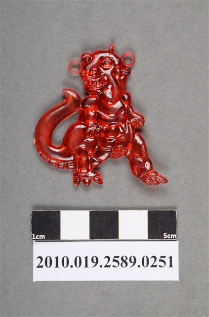 1.本物件為紅色恐龍型尪仔仙。硬質塑膠材質,扁平,單一紅色,雙面浮雕圖案,兩面圖案相同。圖案為站立的恐龍,頭上有角,鼻孔明顯,手有3指,腳為3趾,有尾巴。頭部兩旁有2個小吊環。2.尪仔仙尺寸大致可分成小、中、大型,小型約長2-5公分,中型約長8-15公分,顏色以單色為主。有些大型的則可長達30公分左右,以菩薩、神仙和民間傳說故事人物等造型為主,塗上金銀紅黃彩漆等亮色。1960、70年代的尪仔仙多以民間傳說故事、歌仔戲、布袋戲人物為造型。1980年代改以卡通、電玩、漫畫人物造型為主。常見玩法之一為兩人(或多人)各持一只尪仔仙,輪流用手指彈射,看誰的尪仔仙先疊在對方上面,便可贏得對方用來對戰或是約定的尪仔仙。