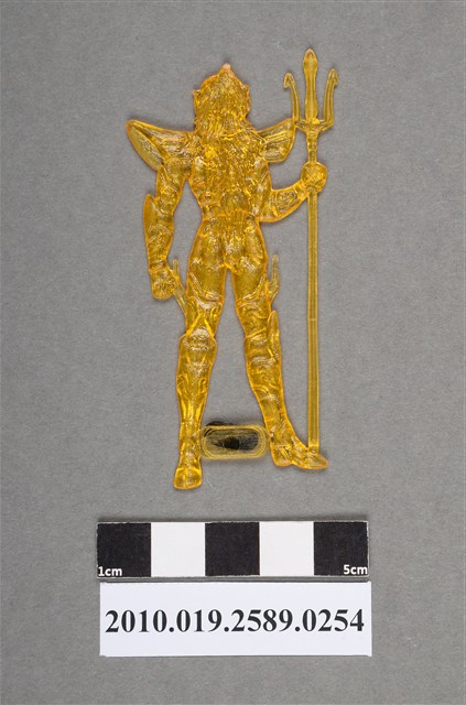 1.本物件為漫畫聖鬥士星矢之海皇波賽頓尪仔仙。硬質塑膠材質,扁平,單一橙色,雙面浮雕圖案。正面圖案為站立的人型,頭戴頭盔,身穿戰甲,一手握拳,另一手拿著三叉戟。雙腳中間有塑膠片,其上貼有貼紙,有木字樣和圖形。