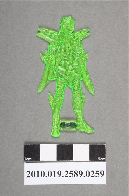 1.本物件為綠色黃金聖鬥士雙魚座阿布羅狄尪仔仙。硬質塑膠材質,扁平,單一綠色,雙面浮雕圖案。正面圖案為站立的人型,身上穿有戰甲(黃金聖衣),肩膀服裝造型有兩層,手套上角狀裝飾,雙手握拳,靴子上亦有角狀裝飾。雙腳中間有塑膠片,其上貼有貼紙,有木字樣和圖形。雙魚座阿布羅狄擅長使用美麗的玫瑰進行攻擊。
