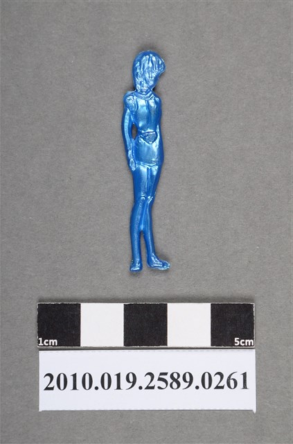 1.本物件為藍色人型尪仔仙。硬質塑膠材質,扁平,單一不透明藍色,雙面浮雕圖案,兩面圖案略同。圖案為站立人型,體型瘦長,腰間繫有腰帶,可見一手自然垂放。2.尪仔仙尺寸大致可分成小、中、大型,小型約長2-5公分,中型約長8-15公分,顏色以單色為主。有些大型的則可長達30公分左右,以菩薩、神仙和民間傳說故事人物等造型為主,塗上金銀紅黃彩漆等亮色。1960、70年代的尪仔仙多以民間傳說故事、歌仔戲、布袋戲人物為造型。1980年代改以卡通、電玩、漫畫人物造型為主。常見玩法之一為兩人(或多人)各持一只尪仔仙,輪流用手指彈射,看誰的尪仔仙先疊在對方上面,便可贏得對方用來對戰或是約定的尪仔仙。