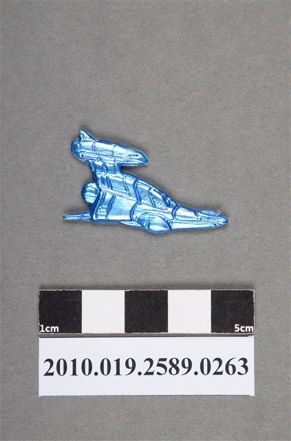 1.本物件為太空梭尪仔仙。硬質塑膠材質,扁平,單一不透明藍色,雙面浮雕圖案,兩面圖案相同。圖案為太空梭,有駕駛艙,駕駛艙旁有進氣口,梭尾有噴射器和尖狀物,梭翼有延伸出似橢圓形物體。2.尪仔仙尺寸大致可分成小、中、大型,小型約長2-5公分,中型約長8-15公分,顏色以單色為主。有些大型的則可長達30公分左右,以菩薩、神仙和民間傳說故事人物等造型為主,塗上金銀紅黃彩漆等亮色。1960、70年代的尪仔仙多以民間傳說故事、歌仔戲、布袋戲人物為造型。1980年代改以卡通、電玩、漫畫人物造型為主。常見玩法之一為兩人(或多人)各持一只尪仔仙,輪流用手指彈射,看誰的尪仔仙先疊在對方上面,便可贏得對方用來對戰或是約定的尪仔仙。