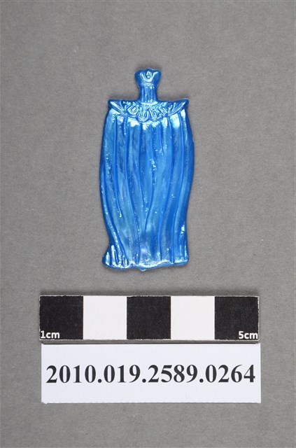 1.本物件為藍色人型尪仔仙。硬質塑膠材質,扁平,單一不透明藍色,雙面浮雕圖案。正面圖案為站立人型,頭上有皇冠狀物品,脖子以下被袍子罩住,看不到身軀和四肢,胸前有裝飾物。2.尪仔仙尺寸大致可分成小、中、大型,小型約長2-5公分,中型約長8-15公分,顏色以單色為主。有些大型的則可長達30公分左右,以菩薩、神仙和民間傳說故事人物等造型為主,塗上金銀紅黃彩漆等亮色。1960、70年代的尪仔仙多以民間傳說故事、歌仔戲、布袋戲人物為造型。1980年代改以卡通、電玩、漫畫人物造型為主。常見玩法之一為兩人(或多人)各持一只尪仔仙,輪流用手指彈射,看誰的尪仔仙先疊在對方上面,便可贏得對方用來對戰或是約定的尪仔仙。