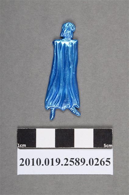 1.本物件為披風人型尪仔仙。硬質塑膠材質,扁平,單一不透明藍色,雙面浮雕圖案。正面圖案為站立人型,服裝造型有披風,長至腳踝,身材瘦,雙手垂下。2.尪仔仙尺寸大致可分成小、中、大型,小型約長2-5公分,中型約長8-15公分,顏色以單色為主。有些大型的則可長達30公分左右,以菩薩、神仙和民間傳說故事人物等造型為主,塗上金銀紅黃彩漆等亮色。1960、70年代的尪仔仙多以民間傳說故事、歌仔戲、布袋戲人物為造型。1980年代改以卡通、電玩、漫畫人物造型為主。常見玩法之一為兩人(或多人)各持一只尪仔仙,輪流用手指彈射,看誰的尪仔仙先疊在對方上面,便可贏得對方用來對戰或是約定的尪仔仙。
