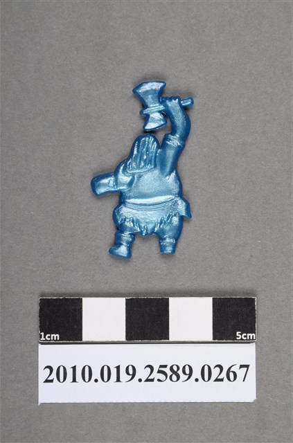 1.本物件為持斧人型尪仔仙。硬質塑膠材質,扁平,單一不透明藍色,雙面浮雕圖案。正面圖案為站立人型,嘴巴張開,表情呈憤怒貌,身形肥胖,左手握拳,右手持斧頭,往上舉。2.尪仔仙尺寸大致可分成小、中、大型,小型約長2-5公分,中型約長8-15公分,顏色以單色為主。有些大型的則可長達30公分左右,以菩薩、神仙和民間傳說故事人物等造型為主,塗上金銀紅黃彩漆等亮色。1960、70年代的尪仔仙多以民間傳說故事、歌仔戲、布袋戲人物為造型。1980年代改以卡通、電玩、漫畫人物造型為主。常見玩法之一為兩人(或多人)各持一只尪仔仙,輪流用手指彈射,看誰的尪仔仙先疊在對方上面,便可贏得對方用來對戰或是約定的尪仔仙。