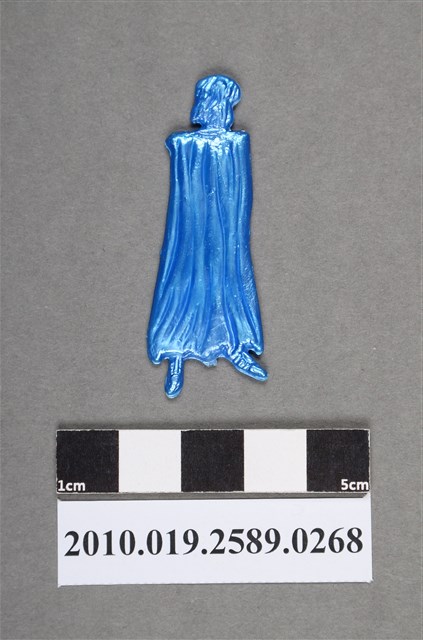 1.本物件為披風人型尪仔仙。硬質塑膠材質,扁平,單一不透明藍色,雙面浮雕圖案。正面圖案為站立人型,服裝造型有披風,長至腳踝,身材瘦,雙手垂下。2.尪仔仙尺寸大致可分成小、中、大型,小型約長2-5公分,中型約長8-15公分,顏色以單色為主。有些大型的則可長達30公分左右,以菩薩、神仙和民間傳說故事人物等造型為主,塗上金銀紅黃彩漆等亮色。1960、70年代的尪仔仙多以民間傳說故事、歌仔戲、布袋戲人物為造型。1980年代改以卡通、電玩、漫畫人物造型為主。常見玩法之一為兩人(或多人)各持一只尪仔仙,輪流用手指彈射,看誰的尪仔仙先疊在對方上面,便可贏得對方用來對戰或是約定的尪仔仙。