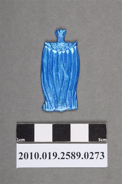 1.本物件為藍色人型尪仔仙。硬質塑膠材質,扁平,單一不透明藍色,雙面浮雕圖案。正面圖案為站立人型,頭上有皇冠狀物品,脖子以下被袍子罩住,看不到身軀和四肢,胸前有裝飾物。2.尪仔仙尺寸大致可分成小、中、大型,小型約長2-5公分,中型約長8-15公分,顏色以單色為主。有些大型的則可長達30公分左右,以菩薩、神仙和民間傳說故事人物等造型為主,塗上金銀紅黃彩漆等亮色。1960、70年代的尪仔仙多以民間傳說故事、歌仔戲、布袋戲人物為造型。1980年代改以卡通、電玩、漫畫人物造型為主。常見玩法之一為兩人(或多人)各持一只尪仔仙,輪流用手指彈射,看誰的尪仔仙先疊在對方上面,便可贏得對方用來對戰或是約定的尪仔仙。
