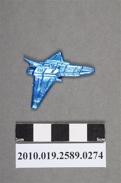 1.本物件為飛機尪仔仙。硬質塑膠材質,扁平,單一不透明藍色,雙面浮雕圖案,兩面圖案相同。圖案為飛機斜側面,機翼靠近機身處有凸出尖狀物,飛機後方有尾翼和噴射器。2.尪仔仙尺寸大致可分成小、中、大型,小型約長2-5公分,中型約長8-15公分,顏色以單色為主。有些大型的則可長達30公分左右,以菩薩、神仙和民間傳說故事人物等造型為主,塗上金銀紅黃彩漆等亮色。1960、70年代的尪仔仙多以民間傳說故事、歌仔戲、布袋戲人物為造型。1980年代改以卡通、電玩、漫畫人物造型為主。常見玩法之一為兩人(或多人)各持一只尪仔仙,輪流用手指彈射,看誰的尪仔仙先疊在對方上面,便可贏得對方用來對戰或是約定的尪仔仙。