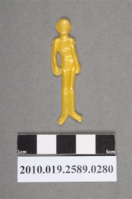 1.本物件為黃色人型尪仔仙。硬質塑膠材質,扁平,單一不透明黃色,雙面浮雕圖案。正面圖案為站立人型,五官不明顯,腰間有腰帶,雙手垂下,雙腳併攏。2.尪仔仙尺寸大致可分成小、中、大型,小型約長2-5公分,中型約長8-15公分,顏色以單色為主。有些大型的則可長達30公分左右,以菩薩、神仙和民間傳說故事人物等造型為主,塗上金銀紅黃彩漆等亮色。1960、70年代的尪仔仙多以民間傳說故事、歌仔戲、布袋戲人物為造型。1980年代改以卡通、電玩、漫畫人物造型為主。常見玩法之一為兩人(或多人)各持一只尪仔仙,輪流用手指彈射,看誰的尪仔仙先疊在對方上面,便可贏得對方用來對戰或是約定的尪仔仙。