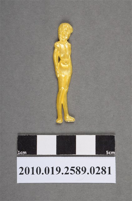 1.本物件為黃色人型尪仔仙。硬質塑膠材質,扁平,單一不透明黃色,雙面浮雕圖案,兩面圖案略同。圖案為站立人型,體型瘦長,腰間繫有腰帶,可見一手自然垂放。2.尪仔仙尺寸大致可分成小、中、大型,小型約長2-5公分,中型約長8-15公分,顏色以單色為主。有些大型的則可長達30公分左右,以菩薩、神仙和民間傳說故事人物等造型為主,塗上金銀紅黃彩漆等亮色。1960、70年代的尪仔仙多以民間傳說故事、歌仔戲、布袋戲人物為造型。1980年代改以卡通、電玩、漫畫人物造型為主。常見玩法之一為兩人(或多人)各持一只尪仔仙,輪流用手指彈射,看誰的尪仔仙先疊在對方上面,便可贏得對方用來對戰或是約定的尪仔仙。