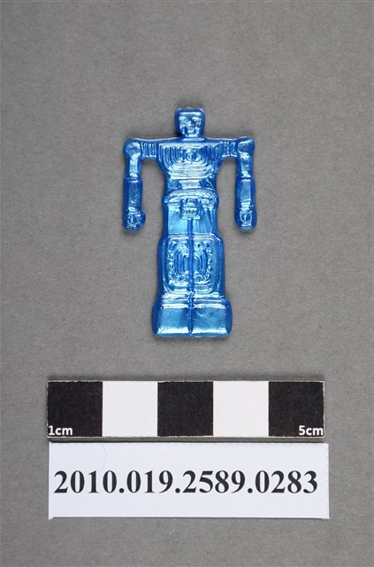 1.本物件為卡通雷霆王之萊機器人尪仔仙。硬質塑膠材質,扁平,單一不透明藍色,雙面浮雕圖案,兩面圖案相同。圖案為站立機器人,頭小身大,頭型為方型,胸前有數條線條圖案和1個圓圈。肩膀明顯,雙手呈拳狀,雙腳併攏。