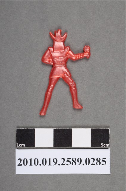 1.本物件為持槌人型尪仔仙。硬質塑膠材質,扁平,單一不透明紅色,雙面浮雕圖案。正面圖案為站立人型,身穿戰甲,頭戴光芒狀頭盔,右手舉著槌型武器,左手彎曲於腹部,呈戰鬥姿勢。2.尪仔仙尺寸大致可分成小、中、大型,小型約長2-5公分,中型約長8-15公分,顏色以單色為主。有些大型的則可長達30公分左右,以菩薩、神仙和民間傳說故事人物等造型為主,塗上金銀紅黃彩漆等亮色。1960、70年代的尪仔仙多以民間傳說故事、歌仔戲、布袋戲人物為造型。1980年代改以卡通、電玩、漫畫人物造型為主。常見玩法之一為兩人(或多人)各持一只尪仔仙,輪流用手指彈射,看誰的尪仔仙先疊在對方上面,便可贏得對方用來對戰或是約定的尪仔仙。