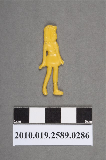 1.本物件為黃色人型尪仔仙。硬質塑膠材質,扁平,單一不透明黃色,雙面浮雕圖案。正面圖案為站立女性人型,髮長及肩,身穿裙子,腰間有腰帶,雙手垂下。2.尪仔仙尺寸大致可分成小、中、大型,小型約長2-5公分,中型約長8-15公分,顏色以單色為主。有些大型的則可長達30公分左右,以菩薩、神仙和民間傳說故事人物等造型為主,塗上金銀紅黃彩漆等亮色。1960、70年代的尪仔仙多以民間傳說故事、歌仔戲、布袋戲人物為造型。1980年代改以卡通、電玩、漫畫人物造型為主。常見玩法之一為兩人(或多人)各持一只尪仔仙,輪流用手指彈射,看誰的尪仔仙先疊在對方上面,便可贏得對方用來對戰或是約定的尪仔仙。