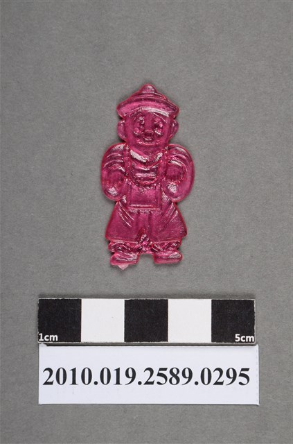 1.本物件為殭屍尪仔仙。硬質塑膠材質,扁平,單一紅色,雙面浮雕圖案,兩面圖案相同。圖案為Q版男性殭屍,因有橢圓形黑眼圈。其表情呈委屈貌,黑眼圈上有表情紋,戴有官帽,身穿官服,胸前有補子,戴有朝珠,雙手往前舉起。2.尪仔仙尺寸大致可分成小、中、大型,小型約長2-5公分,中型約長8-15公分,顏色以單色為主。有些大型的則可長達30公分左右,以菩薩、神仙和民間傳說故事人物等造型為主,塗上金銀紅黃彩漆等亮色。1960、70年代的尪仔仙多以民間傳說故事、歌仔戲、布袋戲人物為造型。1980年代改以卡通、電玩、漫畫人物造型為主。常見玩法之一為兩人(或多人)各持一只尪仔仙,輪流用手指彈射,看誰的尪仔仙先疊在對方上面,便可贏得對方用來對戰或是約定的尪仔仙。