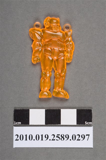 1.本物件為橘色機器人型尪仔仙。硬質塑膠材質,扁平,單一橘色,雙面浮雕圖案,兩面圖案相同。圖案為站立的機器人型,頭部沒有眼睛,頭部兩旁有彎形構件,雙手自然垂下。雙肩上有2個小吊環。2.尪仔仙尺寸大致可分成小、中、大型,小型約長2-5公分,中型約長8-15公分,顏色以單色為主。有些大型的則可長達30公分左右,以菩薩、神仙和民間傳說故事人物等造型為主,塗上金銀紅黃彩漆等亮色。1960、70年代的尪仔仙多以民間傳說故事、歌仔戲、布袋戲人物為造型。1980年代改以卡通、電玩、漫畫人物造型為主。常見玩法之一為兩人(或多人)各持一只尪仔仙,輪流用手指彈射,看誰的尪仔仙先疊在對方上面,便可贏得對方用來對戰或是約定的尪仔仙。