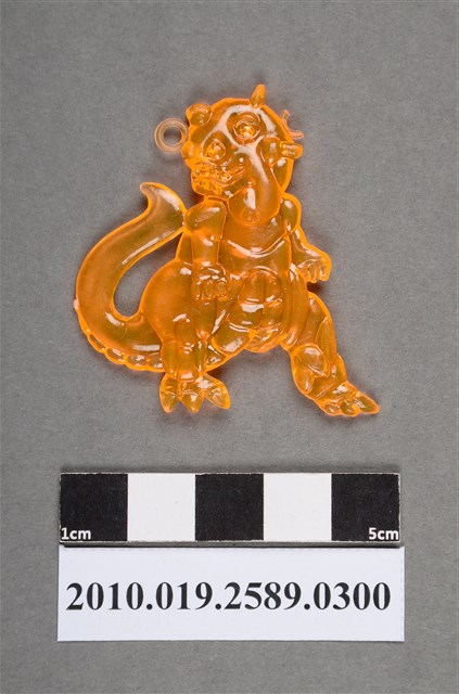1.本物件為橘色恐龍型尪仔仙。硬質塑膠材質,扁平,單一橘色,雙面浮雕圖案,兩面圖案相同。圖案為站立的恐龍,頭上有角,鼻孔明顯,手有3指,腳為3趾,有尾巴。頭部兩旁有2個小吊環,其中一個吊環有破損。2.尪仔仙尺寸大致可分成小、中、大型,小型約長2-5公分,中型約長8-15公分,顏色以單色為主。有些大型的則可長達30公分左右,以菩薩、神仙和民間傳說故事人物等造型為主,塗上金銀紅黃彩漆等亮色。1960、70年代的尪仔仙多以民間傳說故事、歌仔戲、布袋戲人物為造型。1980年代改以卡通、電玩、漫畫人物造型為主。常見玩法之一為兩人(或多人)各持一只尪仔仙,輪流用手指彈射,看誰的尪仔仙先疊在對方上面,便可贏得對方用來對戰或是約定的尪仔仙。