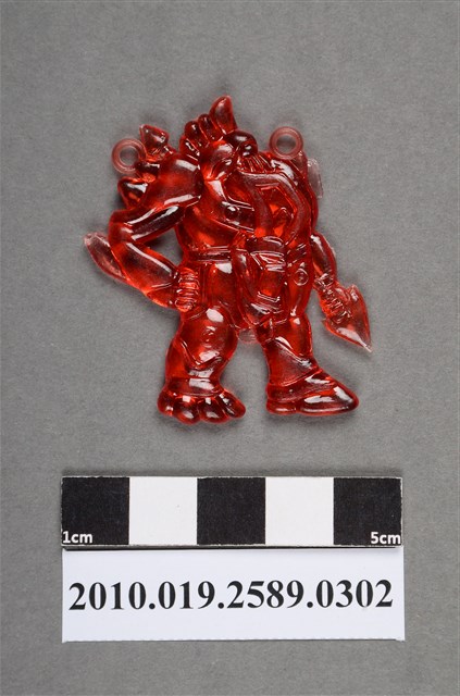 1.本物件為紅色機器人型尪仔仙。硬質塑膠材質,扁平,單一紅色,雙面浮雕圖案,兩面圖案相同。圖案為站立的機器人型,頭部比例小,一手插腰,另一手為箭頭型武器,手臂上有鋸齒狀造型。雙肩上有2個小吊環。2.尪仔仙尺寸大致可分成小、中、大型,小型約長2-5公分,中型約長8-15公分,顏色以單色為主。有些大型的則可長達30公分左右,以菩薩、神仙和民間傳說故事人物等造型為主,塗上金銀紅黃彩漆等亮色。1960、70年代的尪仔仙多以民間傳說故事、歌仔戲、布袋戲人物為造型。1980年代改以卡通、電玩、漫畫人物造型為主。常見玩法之一為兩人(或多人)各持一只尪仔仙,輪流用手指彈射,看誰的尪仔仙先疊在對方上面,便可贏得對方用來對戰或是約定的尪仔仙。