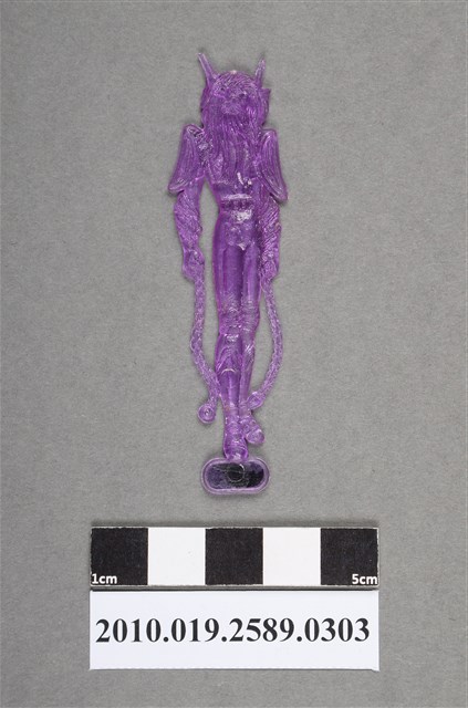 1.本物件為漫畫聖鬥士星矢之青銅聖鬥士仙女座瞬尪仔仙。硬質塑膠材質,扁平,單一紫色,雙面浮雕圖案。正面圖案為站立的人型,頭上有造型物,呈雙角狀,身上穿有戰甲(聖衣),肩膀和手臂處有護甲,雙手用纏繞方式拿著鍊型武器。腳部底下有塑膠片,其上貼有貼紙,有火字樣和圖形。在漫畫設定中,仙女座瞬和天馬座星矢都是青銅聖鬥士。