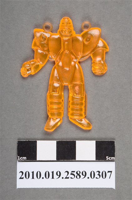 1.本物件為橘色機器人型尪仔仙。硬質塑膠材質,扁平,單一橘色,雙面浮雕圖案,兩面圖案相同。圖案為站立的機器人型,肩膀有橢圓形圖案,腹部有六角形圖案,腿部有環狀造型。雙肩上有2個小吊環。2.尪仔仙尺寸大致可分成小、中、大型,小型約長2-5公分,中型約長8-15公分,顏色以單色為主。有些大型的則可長達30公分左右,以菩薩、神仙和民間傳說故事人物等造型為主,塗上金銀紅黃彩漆等亮色。1960、70年代的尪仔仙多以民間傳說故事、歌仔戲、布袋戲人物為造型。1980年代改以卡通、電玩、漫畫人物造型為主。常見玩法之一為兩人(或多人)各持一只尪仔仙,輪流用手指彈射,看誰的尪仔仙先疊在對方上面,便可贏得對方用來對戰或是約定的尪仔仙。