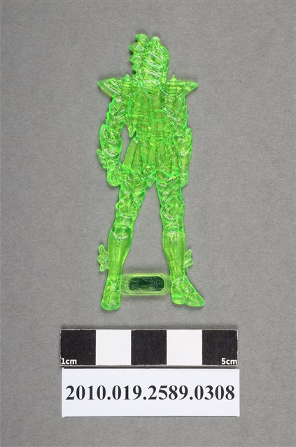1.本物件為綠色人型尪仔仙。硬質塑膠材質,扁平,單一綠色,雙面浮雕圖案。正面圖案為站立的人型,身上穿有戰甲,肩膀造型往外延伸,手套和靴子上有角狀或翅膀型構件。雙腳中間有塑膠片,其上貼有貼紙,有木字樣和圖形。依其造型判斷,此尪仔仙應為漫畫聖鬥士星矢中的人物。2.漫畫聖鬥士星矢為日本漫畫家車田正美之代表作,於西元1985年開始連載,隔年電視動畫版在日本播出,進而風靡全世界。內容為女神雅典娜和聖鬥士們與邪惡勢力展開對戰,保護世界的故事。其後又延伸出其他續集和篇章作品。3.尪仔仙尺寸大致可分成小、中、大型,小型約長2-5公分,中型約長8-15公分,顏色以單色為主。有些大型的則可長達30公分左右,以菩薩、神仙和民間傳說故事人物等造型為主,塗上金銀紅黃彩漆等亮色。1960、70年代的尪仔仙多以民間傳說故事、歌仔戲、布袋戲人物為造型。1980年代改以卡通、電玩、漫畫人物造型為主。常見玩法之一為兩人(或多人)各持一只尪仔仙,輪流用手指彈射,看誰的尪仔仙先疊在對方上面,便可贏得對方用來對戰或是約定的尪仔仙。