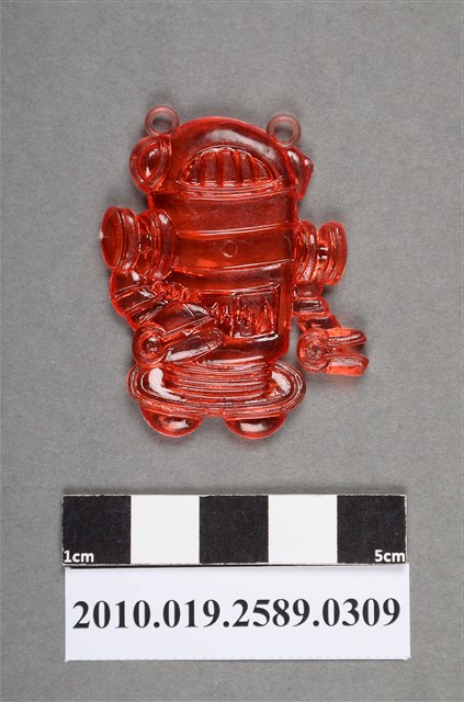 1.本物件為紅色機器人型尪仔仙。硬質塑膠材質,扁平,單一紅色,雙面浮雕圖案,兩面圖案相同。圖案為站立的機器人型,頭部連著身體呈圓桶型,手部呈鉗狀,底部有雙輪。頭上有2個小吊環。2.尪仔仙尺寸大致可分成小、中、大型,小型約長2-5公分,中型約長8-15公分,顏色以單色為主。有些大型的則可長達30公分左右,以菩薩、神仙和民間傳說故事人物等造型為主,塗上金銀紅黃彩漆等亮色。1960、70年代的尪仔仙多以民間傳說故事、歌仔戲、布袋戲人物為造型。1980年代改以卡通、電玩、漫畫人物造型為主。常見玩法之一為兩人(或多人)各持一只尪仔仙,輪流用手指彈射,看誰的尪仔仙先疊在對方上面,便可贏得對方用來對戰或是約定的尪仔仙。