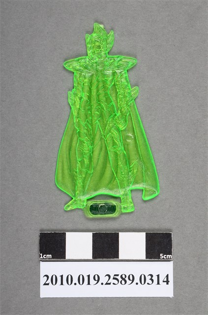 1.本物件為披風人型尪仔仙。硬質塑膠材質,扁平,單一綠色,雙面浮雕圖案。正面圖案為站立的人型,身上穿有戰甲,肩膀造型往外延伸,披有披風,手套和靴子小腿部位上有角狀構件。雙腳中間有塑膠片,其上貼有貼紙,有火字樣和圖形。依其造型判斷,此尪仔仙應為漫畫聖鬥士星矢中的人物。2.漫畫聖鬥士星矢為日本漫畫家車田正美之代表作,於西元1985年開始連載,隔年電視動畫版在日本播出,進而風靡全世界。內容為女神雅典娜和聖鬥士們與邪惡勢力展開對戰,保護世界的故事。其後又延伸出其他續集和篇章作品。3.尪仔仙尺寸大致可分成小、中、大型,小型約長2-5公分,中型約長8-15公分,顏色以單色為主。有些大型的則可長達30公分左右,以菩薩、神仙和民間傳說故事人物等造型為主,塗上金銀紅黃彩漆等亮色。1960、70年代的尪仔仙多以民間傳說故事、歌仔戲、布袋戲人物為造型。1980年代改以卡通、電玩、漫畫人物造型為主。常見玩法之一為兩人(或多人)各持一只尪仔仙,輪流用手指彈射,看誰的尪仔仙先疊在對方上面,便可贏得對方用來對戰或是約定的尪仔仙。