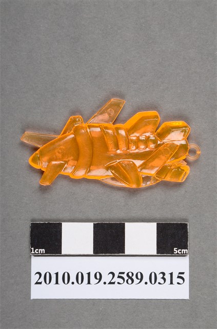 1.本物件為太空梭尪仔仙。硬質塑膠材質,扁平,單一橘色,雙面浮雕圖案,兩面圖案相同。圖案為梭頭兩側有片狀構件之太空梭,梭身有側翼,梭尾有尾翼。尾端有小吊環。2.尪仔仙尺寸大致可分成小、中、大型,小型約長2-5公分,中型約長8-15公分,顏色以單色為主。有些大型的則可長達30公分左右,以菩薩、神仙和民間傳說故事人物等造型為主,塗上金銀紅黃彩漆等亮色。1960、70年代的尪仔仙多以民間傳說故事、歌仔戲、布袋戲人物為造型。1980年代改以卡通、電玩、漫畫人物造型為主。常見玩法之一為兩人(或多人)各持一只尪仔仙,輪流用手指彈射,看誰的尪仔仙先疊在對方上面,便可贏得對方用來對戰或是約定的尪仔仙。
