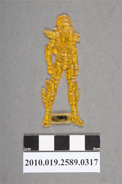 1.本物件為橙色人型尪仔仙。硬質塑膠材質,扁平,單一橙色,雙面浮雕圖案。正面圖案為站立的人型,長髮,身上穿有戰甲,肩膀造型往外延伸,靴子的小腿部位上有片狀構件。雙腳中間有塑膠片,其上貼有貼紙,有火字樣和圖形。依其造型判斷,此尪仔仙應為漫畫聖鬥士星矢中的人物。2.漫畫聖鬥士星矢為日本漫畫家車田正美之代表作,於西元1985年開始連載,隔年電視動畫版在日本播出,進而風靡全世界。內容為女神雅典娜和聖鬥士們與邪惡勢力展開對戰,保護世界的故事。其後又延伸出其他續集和篇章作品。3.尪仔仙尺寸大致可分成小、中、大型,小型約長2-5公分,中型約長8-15公分,顏色以單色為主。有些大型的則可長達30公分左右,以菩薩、神仙和民間傳說故事人物等造型為主,塗上金銀紅黃彩漆等亮色。1960、70年代的尪仔仙多以民間傳說故事、歌仔戲、布袋戲人物為造型。1980年代改以卡通、電玩、漫畫人物造型為主。常見玩法之一為兩人(或多人)各持一只尪仔仙,輪流用手指彈射,看誰的尪仔仙先疊在對方上面,便可贏得對方用來對戰或是約定的尪仔仙。