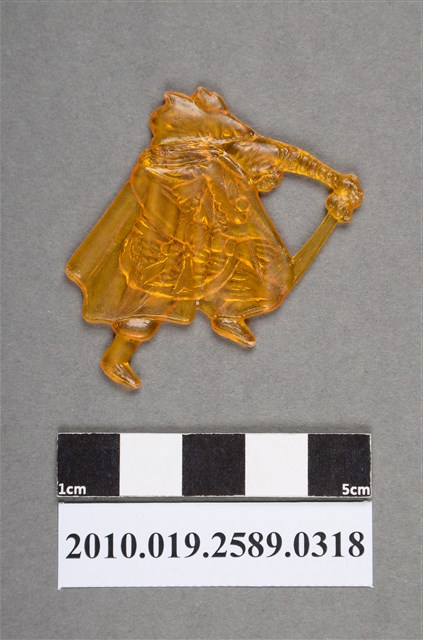 1.本物件為漫畫諸葛四郎之龍頭尪仔仙。硬質塑膠材質,扁平,單一橙色,雙面浮雕圖案。正面圖案為龍頭人身,嘴巴張開,服裝為古代風格,披有披風,左手往前伸,右手拿著刀,左腳伸直,右腳彎曲。在漫畫中,龍頭為武功高強的反派角色。