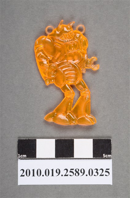 1.本物件為橘色機器人型尪仔仙。硬質塑膠材質,扁平,單一橘色,雙面浮雕圖案,兩面圖案相同。圖案為站立的機器人型,頭部有雙角,胸前有2個圓圈交疊的圖案,手掌部位呈彎月狀。肩上有2個小吊環。2.尪仔仙尺寸大致可分成小、中、大型,小型約長2-5公分,中型約長8-15公分,顏色以單色為主。有些大型的則可長達30公分左右,以菩薩、神仙和民間傳說故事人物等造型為主,塗上金銀紅黃彩漆等亮色。1960、70年代的尪仔仙多以民間傳說故事、歌仔戲、布袋戲人物為造型。1980年代改以卡通、電玩、漫畫人物造型為主。常見玩法之一為兩人(或多人)各持一只尪仔仙,輪流用手指彈射,看誰的尪仔仙先疊在對方上面,便可贏得對方用來對戰或是約定的尪仔仙。