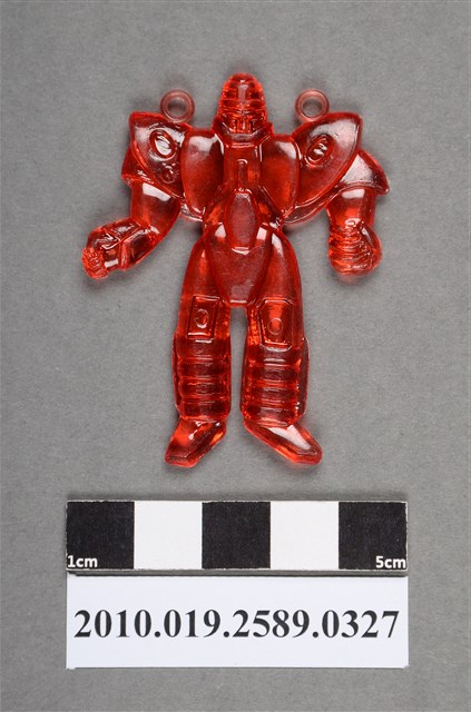 1.本物件為紅色機器人型尪仔仙。硬質塑膠材質,扁平,單一紅色,雙面浮雕圖案,兩面圖案相同。圖案為站立的機器人型,肩膀有橢圓形圖案,腹部有六角形圖案,腿部有環狀造型。雙肩上有2個小吊環。2.尪仔仙尺寸大致可分成小、中、大型,小型約長2-5公分,中型約長8-15公分,顏色以單色為主。有些大型的則可長達30公分左右,以菩薩、神仙和民間傳說故事人物等造型為主,塗上金銀紅黃彩漆等亮色。1960、70年代的尪仔仙多以民間傳說故事、歌仔戲、布袋戲人物為造型。1980年代改以卡通、電玩、漫畫人物造型為主。常見玩法之一為兩人(或多人)各持一只尪仔仙,輪流用手指彈射,看誰的尪仔仙先疊在對方上面,便可贏得對方用來對戰或是約定的尪仔仙。