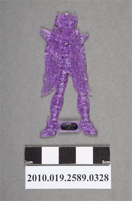 1.本物件為漫畫聖鬥士星矢之黃金聖鬥士射手座艾奧羅斯尪仔仙。硬質塑膠材質,扁平,單一紫色,雙面浮雕圖案。正面圖案為站立的人型,身上穿有戰甲(黃金聖衣),頭上有翅膀狀裝飾物,肩膀服裝造型明顯,黃金聖衣造型有翅膀。雙腳中間有塑膠片,其上貼有貼紙,有火字樣和圖形。射手座艾奧羅斯武器為黃金弓箭。