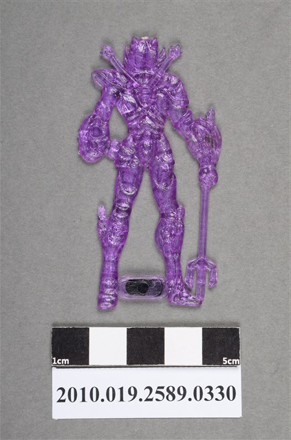 1.本物件為漫畫聖鬥士星矢之黃金聖鬥士天秤座童虎尪仔仙。硬質塑膠材質,扁平,單一紫色,雙面浮雕圖案。正面圖案為站立的人型,身上穿有戰甲(黃金聖衣),背上有角狀裝飾,手套外側有圓形盾牌,右手持三叉戟。雙腳中間有塑膠片,其上貼有貼紙,有木字樣和圖形。天秤座童虎必殺技能為廬山昇龍霸等。