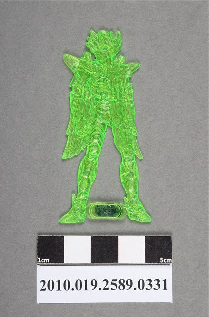1.本物件為漫畫聖鬥士星矢之黃金聖鬥士射手座艾奧羅斯尪仔仙。硬質塑膠材質,扁平,單一綠色,雙面浮雕圖案。正面圖案為站立的人型,身上穿有戰甲(黃金聖衣),頭上有翅膀狀裝飾物,肩膀服裝造型明顯,黃金聖衣造型有翅膀。雙腳中間有塑膠片,其上貼有貼紙,有火字樣和圖形。射手座艾奧羅斯武器為黃金弓箭。