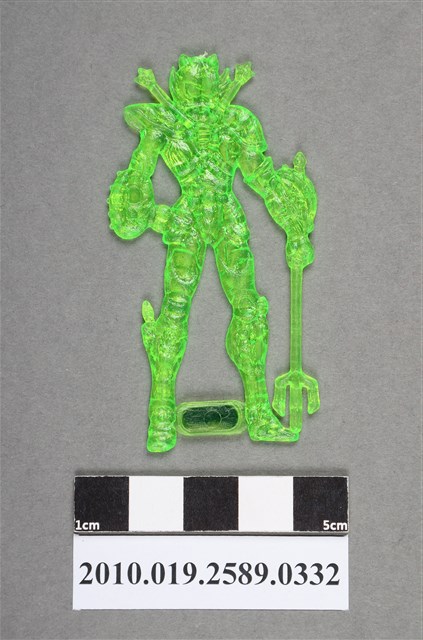 1.本物件為漫畫聖鬥士星矢之黃金聖鬥士天秤座童虎尪仔仙。硬質塑膠材質,扁平,單一綠色,雙面浮雕圖案。正面圖案為站立的人型,身上穿有戰甲(黃金聖衣),背上有角狀裝飾,手套外側有圓形盾牌,右手持三叉戟。雙腳中間有塑膠片,其上貼有貼紙,有火字樣和圖形。天秤座童虎必殺技能為廬山昇龍霸等。