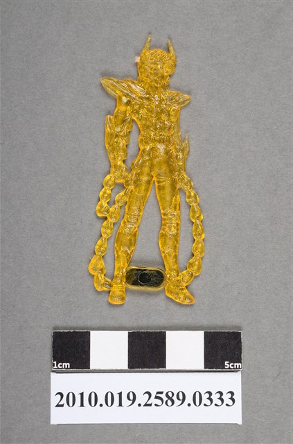 1.本物件為漫畫聖鬥士星矢之青銅聖鬥士鳳凰座一輝尪仔仙。硬質塑膠材質,扁平,單一橙色,雙面浮雕圖案。正面圖案為站立的人型,頭上有角狀造型物,身上穿有戰甲(聖衣)以及鳳凰鳥尾的鍊狀造型。雙腳中間有塑膠片,其上貼有貼紙,有水字樣和圖形。在漫畫設定中,鳳凰座一輝和天馬座星矢都是青銅聖鬥士。