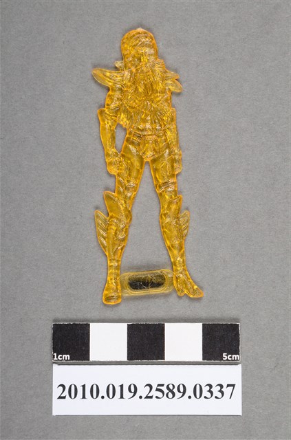 1.本物件為橙色人型尪仔仙。硬質塑膠材質,扁平,單一橙色,雙面浮雕圖案。正面圖案為站立的人型,長髮,身上穿有戰甲,肩膀造型往外延伸,靴子的小腿部位上有片狀構件。雙腳中間有塑膠片,其上貼有貼紙,有水字樣和圖形。依其造型判斷,此尪仔仙應為漫畫聖鬥士星矢中的人物。2.漫畫聖鬥士星矢為日本漫畫家車田正美之代表作,於西元1985年開始連載,隔年電視動畫版在日本播出,進而風靡全世界。內容為女神雅典娜和聖鬥士們與邪惡勢力展開對戰,保護世界的故事。其後又延伸出其他續集和篇章作品。3.尪仔仙尺寸大致可分成小、中、大型,小型約長2-5公分,中型約長8-15公分,顏色以單色為主。有些大型的則可長達30公分左右,以菩薩、神仙和民間傳說故事人物等造型為主,塗上金銀紅黃彩漆等亮色。1960、70年代的尪仔仙多以民間傳說故事、歌仔戲、布袋戲人物為造型。1980年代改以卡通、電玩、漫畫人物造型為主。常見玩法之一為兩人(或多人)各持一只尪仔仙,輪流用手指彈射,看誰的尪仔仙先疊在對方上面,便可贏得對方用來對戰或是約定的尪仔仙。