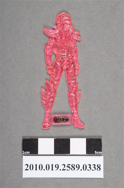 1.本物件為粉紅色人型尪仔仙。硬質塑膠材質,扁平,單一粉紅色,雙面浮雕圖案。正面圖案為站立的人型,長髮,身上穿有戰甲,肩膀造型往外延伸,靴子的小腿部位上有片狀構件。雙腳中間有塑膠片,其上貼有貼紙,有水字樣和圖形。依其造型判斷,此尪仔仙應為漫畫聖鬥士星矢中的人物。2.漫畫聖鬥士星矢為日本漫畫家車田正美之代表作,於西元1985年開始連載,隔年電視動畫版在日本播出,進而風靡全世界。內容為女神雅典娜和聖鬥士們與邪惡勢力展開對戰,保護世界的故事。其後又延伸出其他續集和篇章作品。3.尪仔仙尺寸大致可分成小、中、大型,小型約長2-5公分,中型約長8-15公分,顏色以單色為主。有些大型的則可長達30公分左右,以菩薩、神仙和民間傳說故事人物等造型為主,塗上金銀紅黃彩漆等亮色。1960、70年代的尪仔仙多以民間傳說故事、歌仔戲、布袋戲人物為造型。1980年代改以卡通、電玩、漫畫人物造型為主。常見玩法之一為兩人(或多人)各持一只尪仔仙,輪流用手指彈射,看誰的尪仔仙先疊在對方上面,便可贏得對方用來對戰或是約定的尪仔仙。