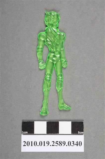 1.本物件為綠色人型尪仔。硬質塑膠材質,扁平,單一綠色,雙面浮雕圖案,兩面圖案相同。圖案為站立男性人型,頭戴面具式頭盔,頭盔上有角狀構件,雙手握拳垂下,有護膝裝備。