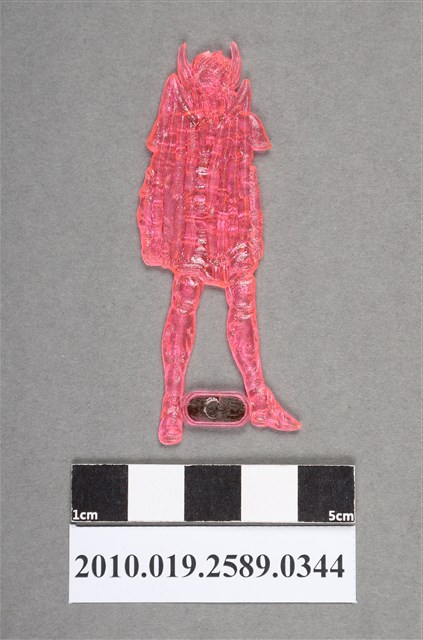 1.本物件為漫畫聖鬥士星矢之黃金聖鬥士射手座艾奧羅斯尪仔仙。硬質塑膠材質,扁平,單一粉紅色,雙面浮雕圖案。正面圖案為站立的人型,身上穿有戰甲(黃金聖衣),頭上有翅膀狀裝飾物,黃金聖衣造型有翅膀。雙腳中間有塑膠片,其上貼有貼紙,有水字樣和圖形。射手座艾奧羅斯武器為黃金弓箭。